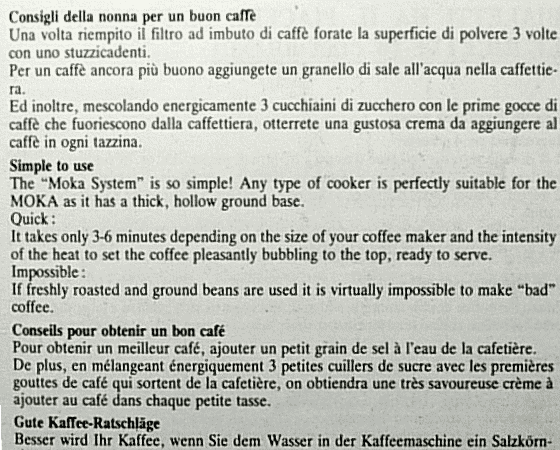 私のものは、イタリアで最も普及しているといわれるBIALETTI社製<<MOKA EXPRESS>>の1985年ころの説明書なので、最近のものは改訂されているのかもしれないが、もしあまり変わっていないとしたら、日本のほとんどの利用者は英語の部分だけを読んでいるだろうから正しく伝わっていないんだと思う(試しに、WWW上で検索してみたら、全く間違った「使い方」が載っているのも見つかったので)。